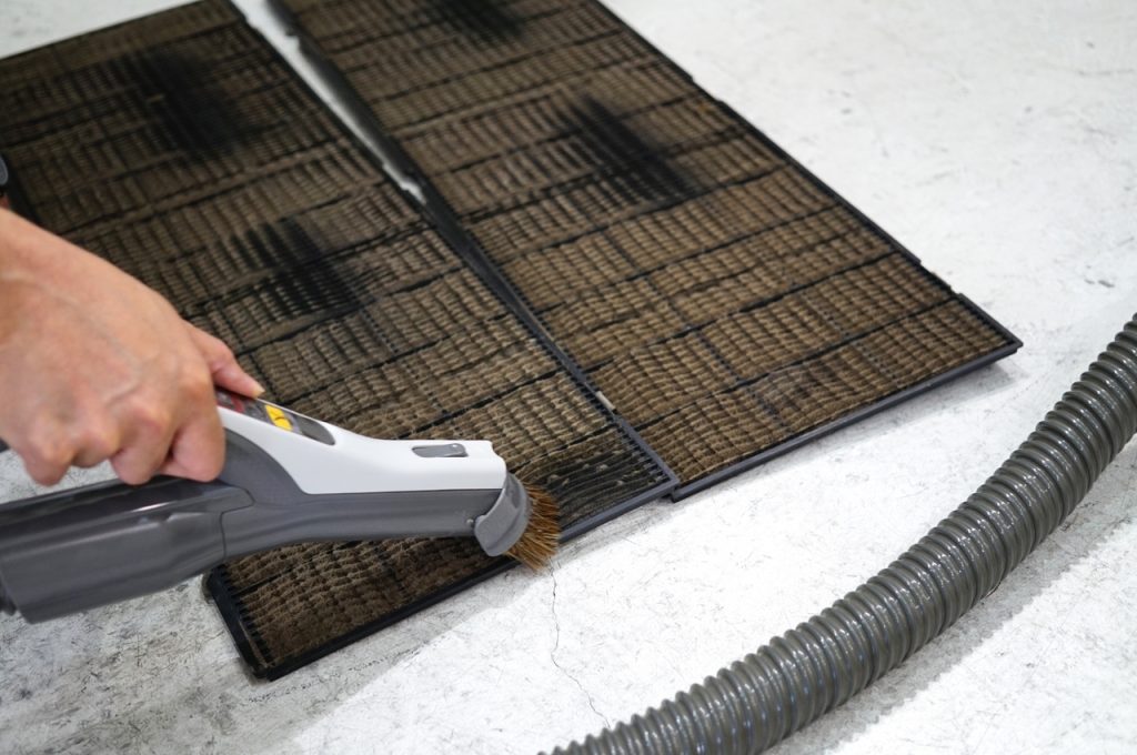 目詰まりしたフィルターを専用洗剤と高圧洗浄機で清掃。